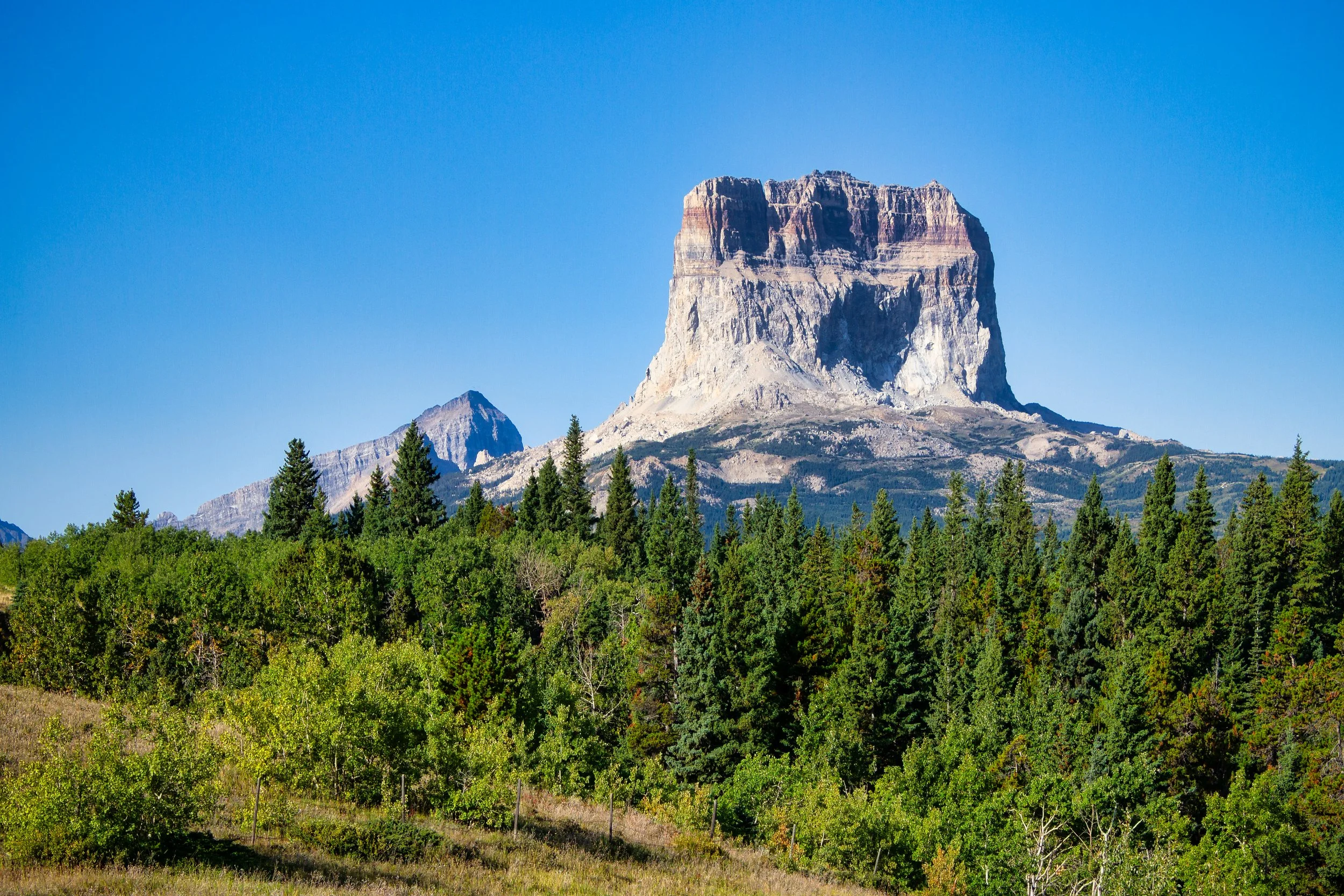 Chief Mountain, while not the tallest in Glacier, stands prominently among the Rockies' eastern peaks and overlooks the plains, visible from over a hundred miles away. It marks the Blackfoot Confederacy's territory in the US and Canada, guiding travelers. Known as "Ninaistako," it is seen as powerful and wise. The Blackfeet continue their ancient rituals there, viewing Chief Mountain as the oldest spirit connected to their creation stories.